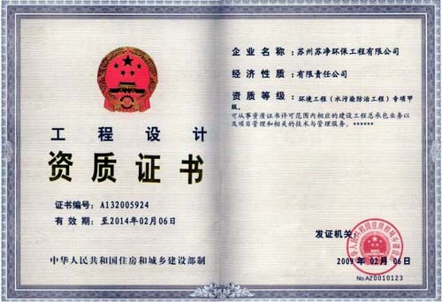 日前,公司(si)控股子公司(si)江蘇蘇凈集團下屬的蘇凈環保工(gong)(gong)程有限公司(si)榮(rong)獲了由國(guo)家住房(fang)和城(cheng)鄉(xiang)建設部(bu)頒發的環境工(gong)(gong)程(水污染防治(zhi)工(gong)(gong)程)專項甲級(ji)資質。